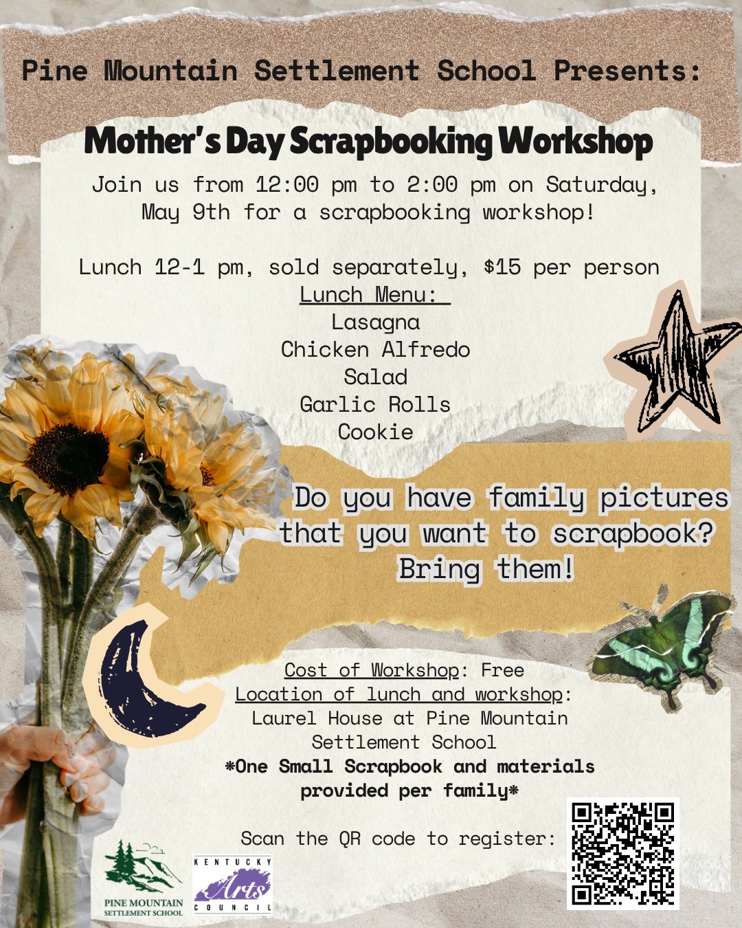 Mothers and memories are precious! Celebrate both with our Mother’s Day Scrapbooking Workshop on Saturday, May 9th from 12 pm to 2 pm in Laurel House on our historic campus. Participants will receive one small scrapbook and materials per family. This is FREE workshop, but participants may register separately for our Mother’s Day Lunch from 12 pm to 1pm. Check out the flyer for more detail and register below!